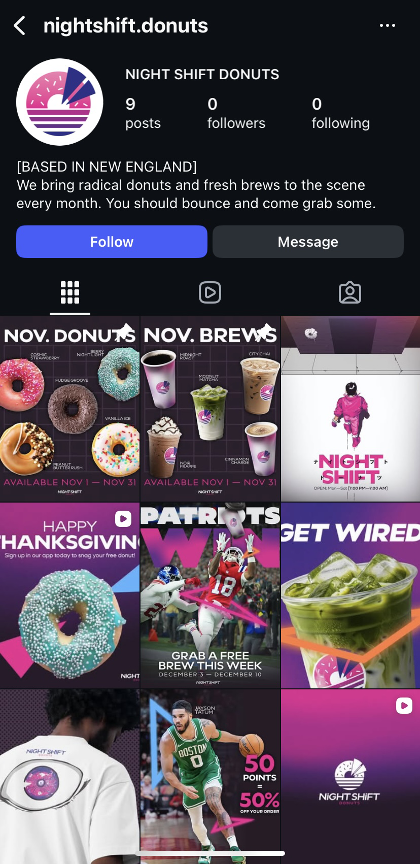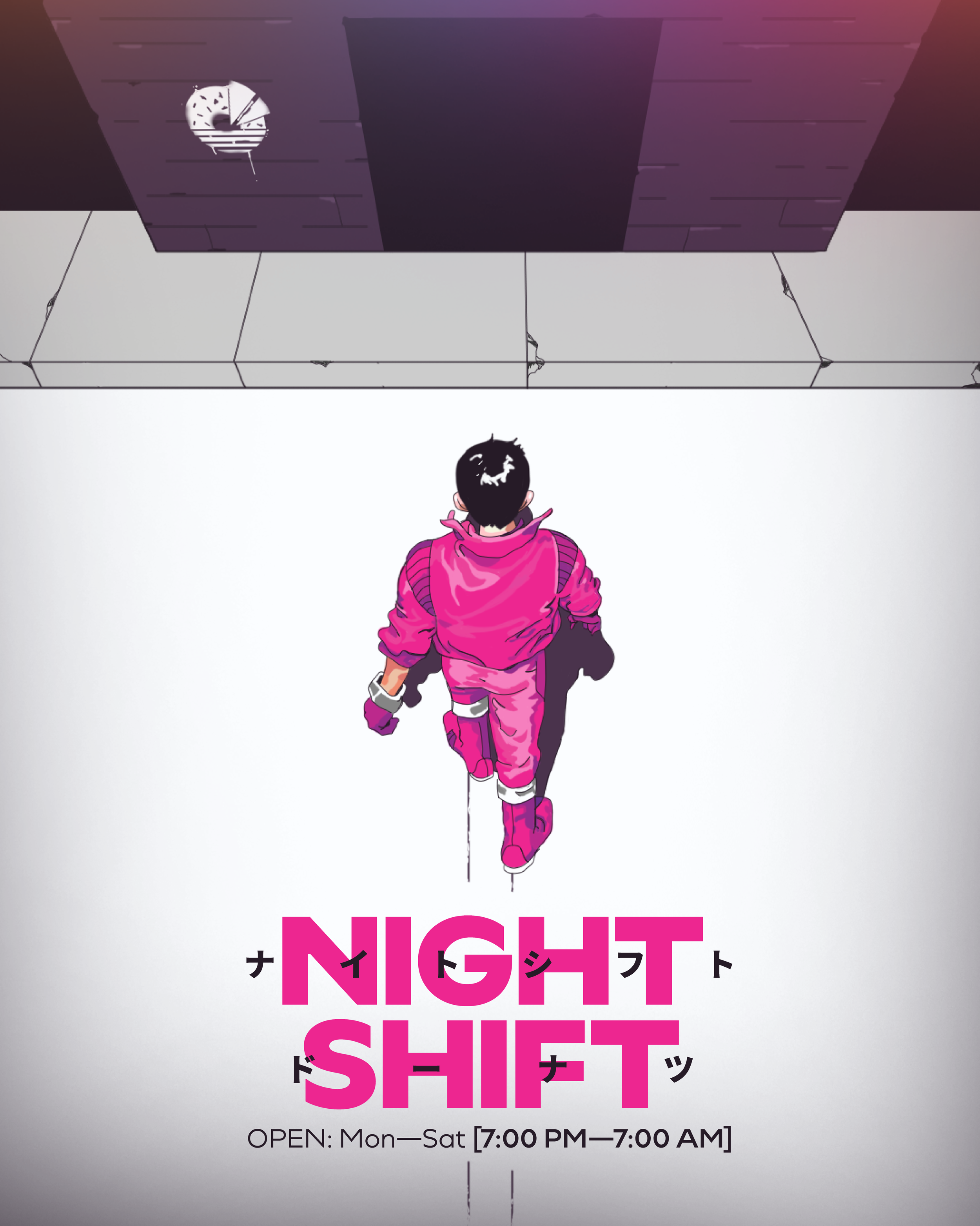 Night Shift Donuts is a LA based series of donut shops around the West Coast area. The visual identity is based on retro city pop aesthetics and the synthwave music genre of the 1980s.